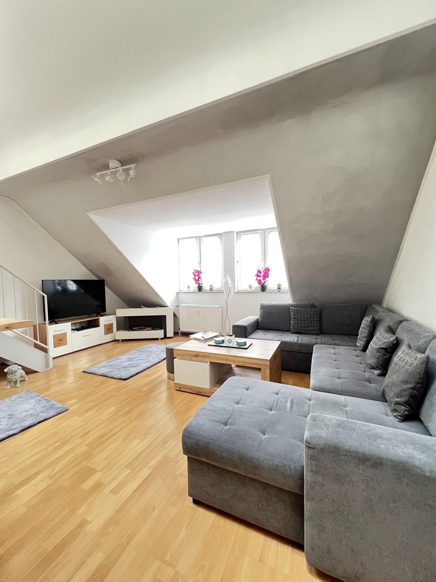 Über eine Treppe gelangen Sie in die zweite Etage der Wohnung, die durch zwei große Dachfenster eine helle und luftige Atmosphäre bietet. Der Ausblick auf das Wohnzimmer im unteren Geschoss sorgt für ein großzügiges Raumgefühl. Auf dieser Etage befindet sich Platz für ein bequemes Doppelbett und diverse Möbelstücke, die den Raum perfekt ausfüllen.